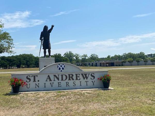 For decades, drivers turning from U.S. 401 onto the campus of St. Andrews University in Laurinburg saw crepe myrtles, pine trees, and flags adorned with azure shields.